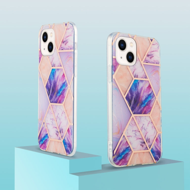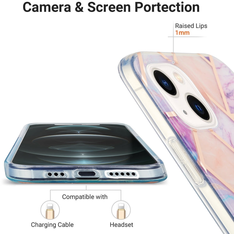 For iPhone 15 Electroplating Splicing Marble Flower Pattern Dual-side IMD TPU Shockproof Phone Case(Light Purple)