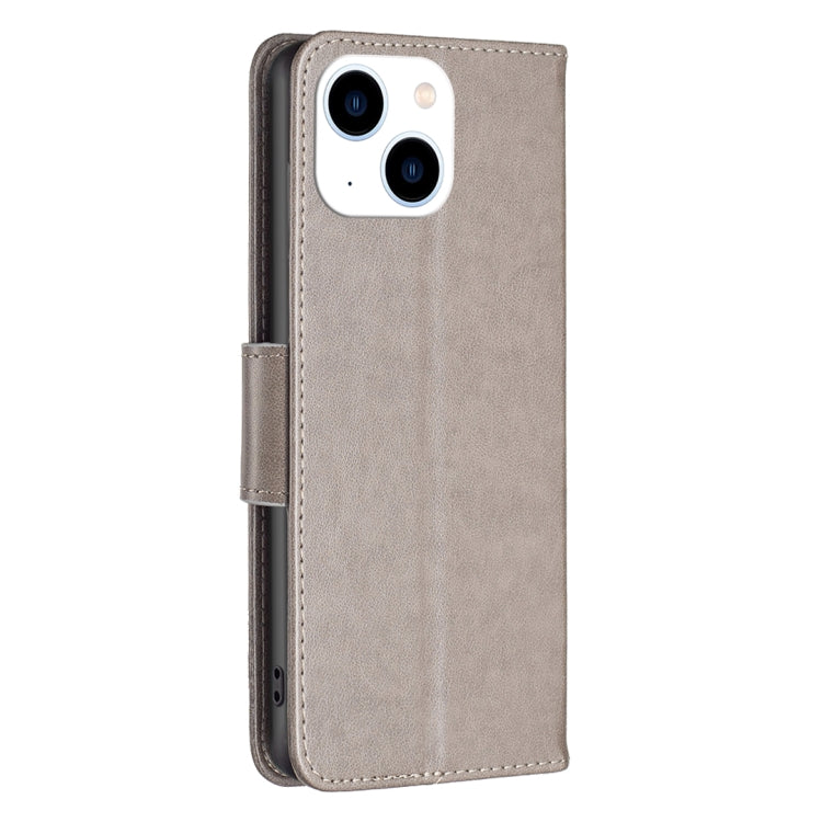 For iPhone 15 Embossing Two Butterflies Pattern Leather Phone Case(Grey)