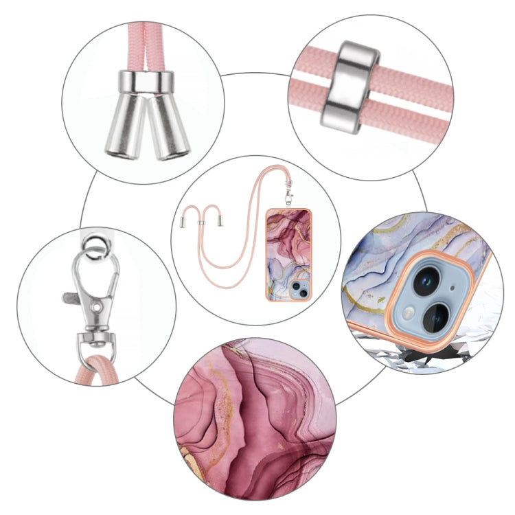 For iPhone 15 Electroplating Marble Dual-side IMD Phone Case with Lanyard(Rose Red 014)