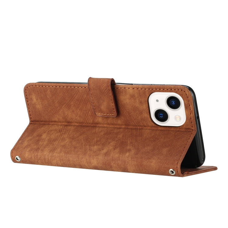 For iPhone 15 Skin Feel Stripe Pattern Leather Phone Case with Lanyard(Brown)