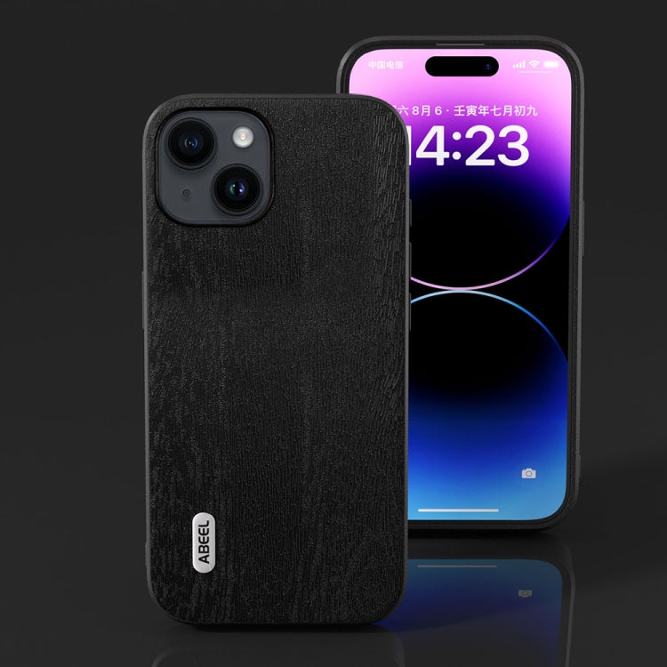 For iPhone 15 ABEEL Wood Texture PU Phone Case(Black)